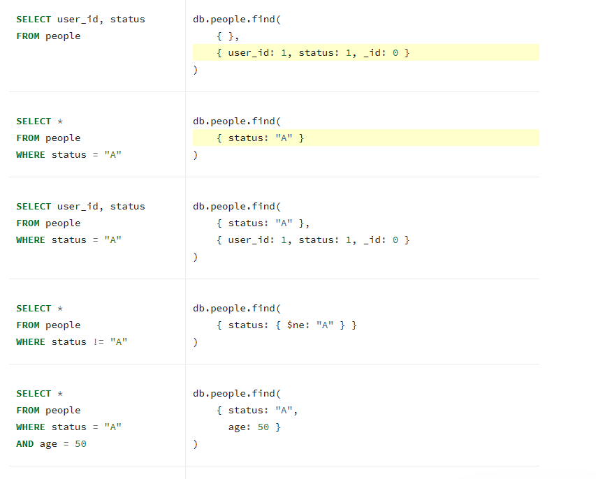 자세한 내용은 링크 참고 https://docs.mongodb.com/manual/reference/sql-comparison/
