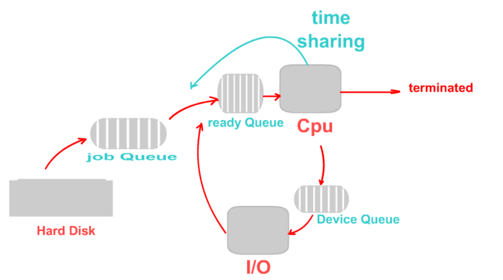 또 CPU는 하나뿐이니 메인메모리에 올라온 이후에도 역시 줄을 서서 기다려야 한다. 실행된 후 시간이 지나면 앞서 말