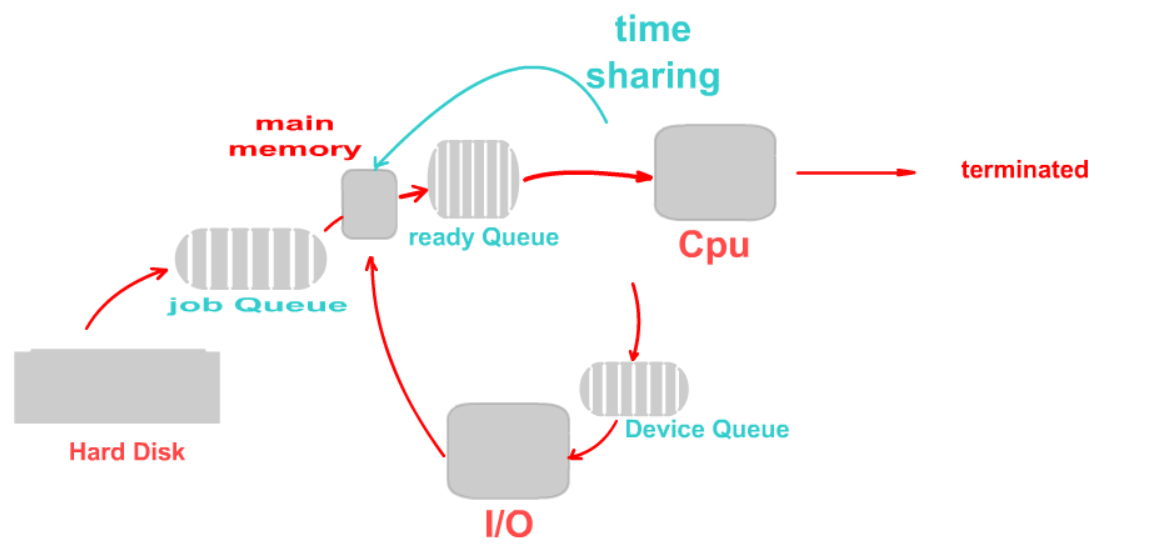 반환시간(Turnaround time) : 작업이 메인 메모리에 레디 큐로 들어간 시간부터 terminated 된 시간까지 sec