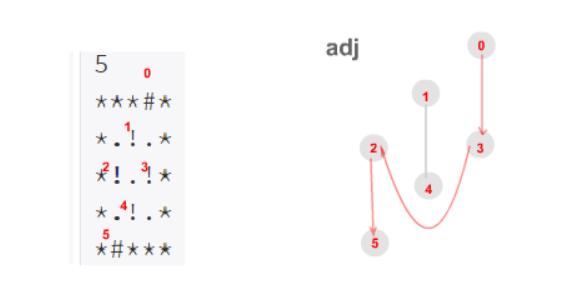 첫째 줄에 집의 크기 N (1 ≤ N ≤ 50)이 주어진다. 다음 N개의 줄에는 N개의 문자로 집에 대한 정보가 주어진다. ‘#’는 문이 설치된 곳으로 항상 두 곳이며, ‘.’은 아무 것도 없는 것으로 빛은 이 곳을 통과한다. ‘!’은 거울을 설치할 수 있는 위치를 나타내고, ‘*’은 빛이 통과할 수 없는 벽을 나타낸다.