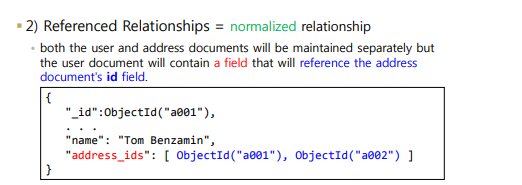 이 2가지 이외에 몽고 DB만의 referenced 방법이 또 있다. reference에 대한 값을 일일이 손으로 넣어줘야