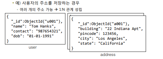 문서 하나로 유저 정보하고 주소 정보들을 하나로 묶어서 표현하는 방식.