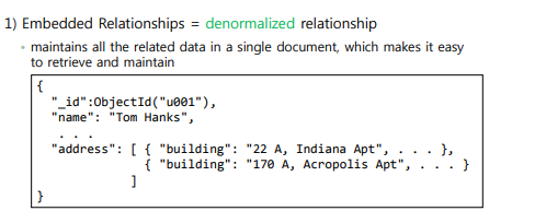 임베디드 방식 유저와 어드레스 문서를 연계시켜서 검색할 필요 없이 싱글 문서 하나에 모든 정보가 다 들어 있고 질의할 때에 편하다.