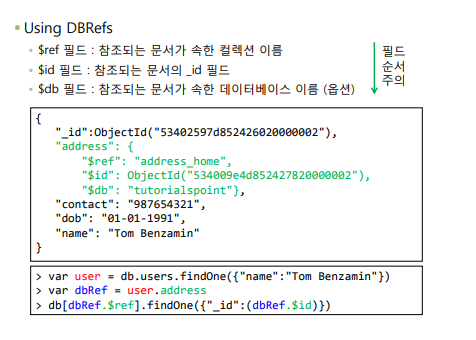 DBRefs 방식 : 특별히 서로 다른 컬렉션에 들어있는 reference 방식을 표현하고자 할 때 쓸 수 있다.