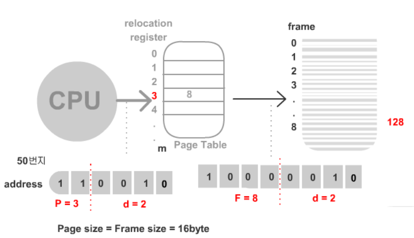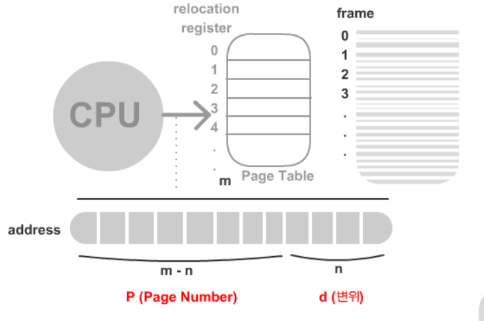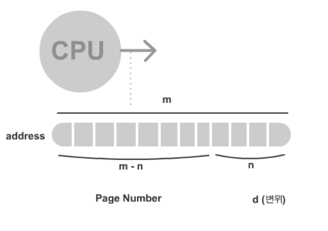 이 주소중 m-n 은 P 페이징 넘버 ( 페이지 테이블의 인덱스 ) 에 n을 d ( 변위 , 오프셋, 몇 번째에 떨어져 있는지 )에 쓰게