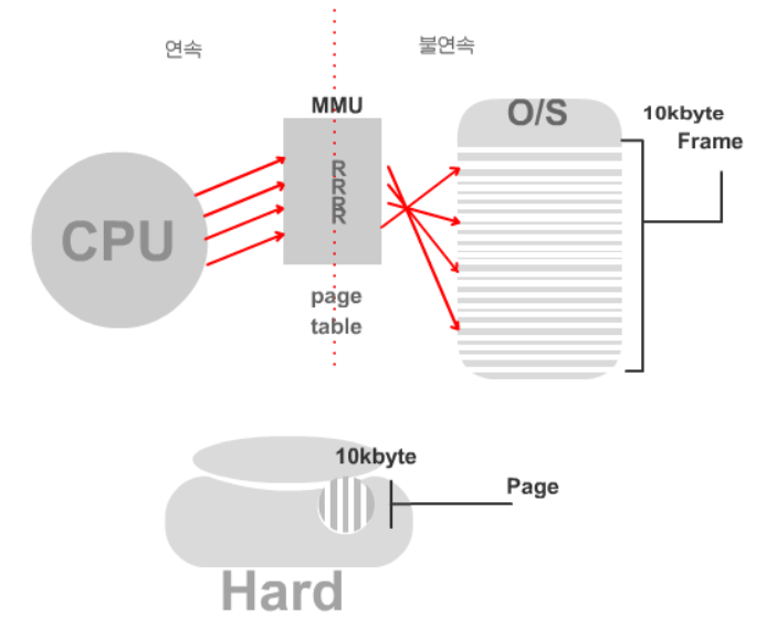 CPU는 프로세스가 연속된 메모리 공간에 있다고 착각하고 메모리상에 실제로는 떨어져 있으니