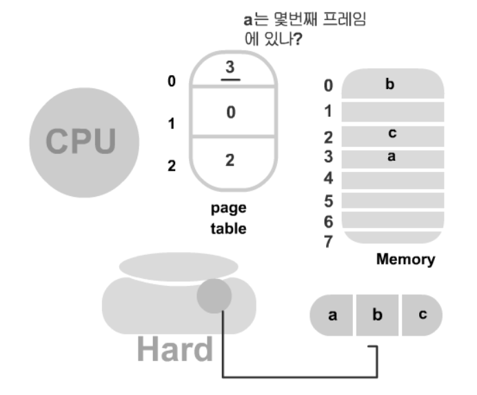 잘라진 페이지의 수만큼(3개) 페이지 테이블 인덱스를 만들고 페이지 테이블의 주소를 프레임 번호로 주면