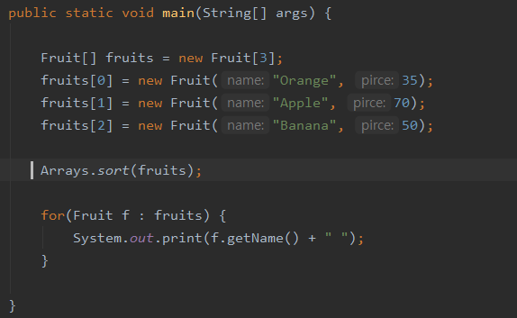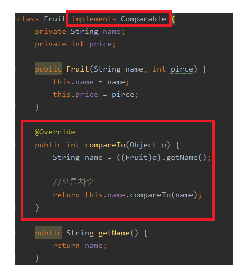 다음과 같이 새롭게 정의한 Fruit 클래스는 Comparable 인터페이스를 구현하고 CompareTo() 메서드를 오버 라이딩
