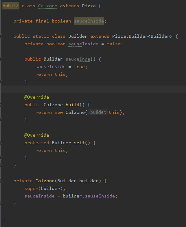 - self()는 calzone에 빌더 자체를 리턴하게 돼있다. 따라서 calzone의 메서드를 사용할 수 있다.
