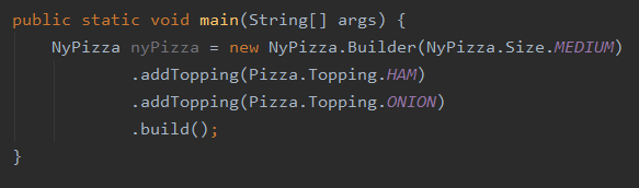 - 그 후 Pizza라는 생성자에서 Builder를 받아서 Pizza가 가진 토핑을 빌더가 가진 토핑으로 세팅을 해준다.