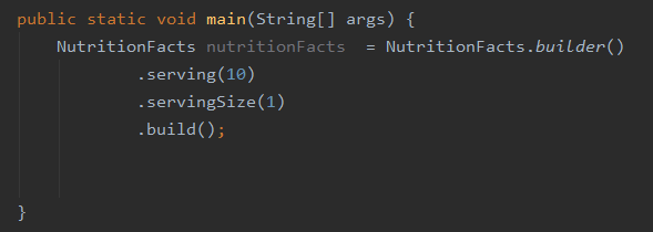 - 이런 생성자의 신축성과 세터를 사용할 때의 가독성을 모두 취하는 방법이 빌더 패턴이다.