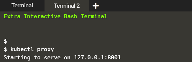 프록시는 Terminal2에 동작하고 커맨드들은 Terminal1에서 돌고 있다. 프록시는 여전히 두 번째 탭에서 돌고 있다.