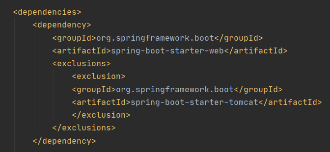 build 툴로는 maven을 사용하였는데 다음과 같이 exclusions을 통해 톰캣을 빼주자.