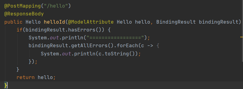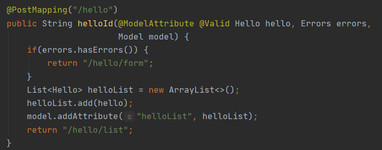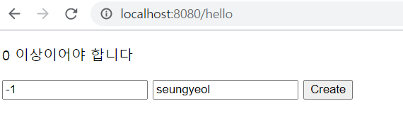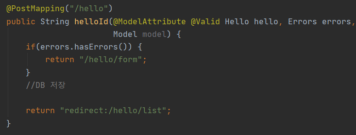 /hello/form - 만일 hello에 @Valid에 위배되는 조건이 온다면 "/hello/form"으로 가게 된다.