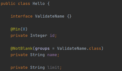 - 다음과 같이 @Validated 그룹으로 ValidateName을 주게 되면