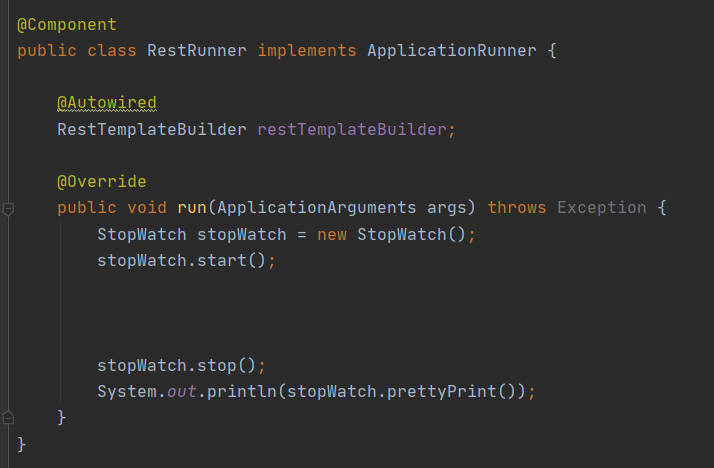 - 다음과 같은 RestRunner는 restTemplateBuilder를 주입받은 후 "/hello"와 "/world"를 호출할 것이다.