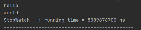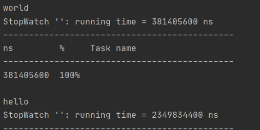 12345678910111213141516171819202122232425262728293031323334353637383940414243444546474849505152@Componentpublic class RestRunner implements ApplicationRunner {@AutowiredWebClient.Builder builder;@Overridepublic void run(ApplicationArguments args) throws Exception {WebClient webClient = builder.build();StopWatch stopWatch = new StopWatch();stopWatch.start();// TODO /helloMono<String> helloMono = webClient.get().uri("http://localhost:8080/hello").retrieve().bodyToMono(String.class);helloMono.subscribe(s -> {System.out.println(s);if(stopWatch.isRunning()) {stopWatch.stop();}System.out.println(stopWatch.prettyPrint());stopWatch.start();});// TODO /worldMono<String> worldMono = webClient.get().uri("http://localhost:8080/world").retrieve().bodyToMono(String.class);worldMono.subscribe(s -> {System.out.println(s);if(stopWatch.isRunning()) {stopWatch.stop();}System.out.println(stopWatch.prettyPrint());stopWatch.start();});stopWatch.stop();System.out.println(stopWatch.prettyPrint());}}cs