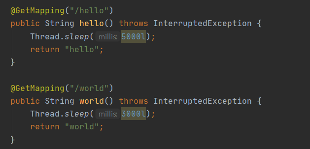 - 다음과 같이 "/hello" URI는 5초를 쉬고 "/world" URI는 3초를 쉬는 핸들러를 만들어보자.