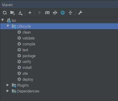 - 메이븐은 프레임워크이기 때문에 동작 방식이 정해져 있고, 미리 정의하고 있는 빌드 순서가 있다. 이를 라이프사이클(Lifecycle)이라 한다.