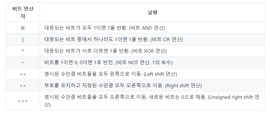 - 0과 1로 표현 가능한 정수 타입만 비트 연산이 가능하다.