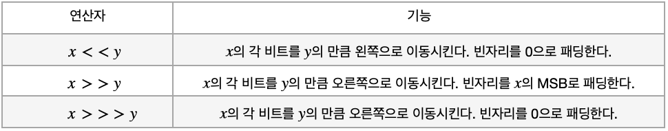 - 먼저 Shift 연산은 비트 이동 연산자라고 하며 다음과 같이 세 가지 연산자가 있다.
