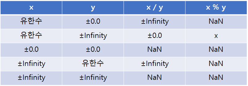 - 0이 아닌 부동 소수점 값을 사용하는 것은 가능하지만 이 경우 무한대가 반환된다.