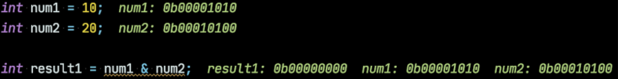 123456789int num1 = 10;int num2 = 20;int result1 = num1 & num2; // 0int num3 = 11;int num4 = 15;int result2 = num3 & num4; // 11cs - rresult1과 result2의 결과가 왜 0과 11일까?