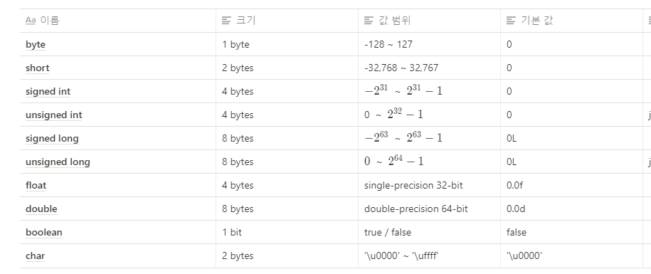 - 타입의 종류와 값의 범위 기본값을 다음과 같은 표로 정리해 보았다.