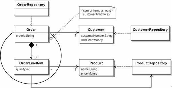 - 다음은 AGGREGATE와 ENTRY POINT를 결정한 후 REPOSITORY를 추가한 주문 도메인 모델을 도시한 것이다.