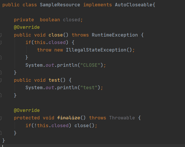 - 실제로 자바에서 제공하는 FileInputStream, FileOutputStream, ThreadPoolExecutor 그리고 java.sql.Connection에는 안전망으로 동작하는 finalizer가 있다.