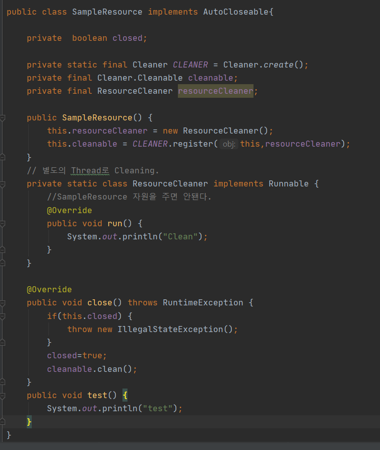 - Cleaner 스레드를 만들 클래스는 반드시 static 클래스여야 한다. non-static 클래스(익명 클래스도 마찬가지)의 인스턴스는 그걸 감싸고 있는 클래스의 인스턴스를 잠조하지 않는다.