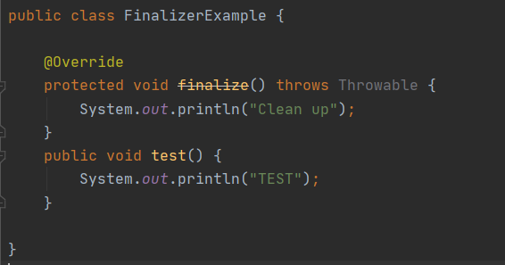- C++에서의 destructor랑은 다르다고 한다. C++의 destructor는 어떤 객체와 연관이는 자원을 반납할 때도 사용하지만, 자바에서는 try-with-resources또는 try-finally 블록이 그 역할을 한다.