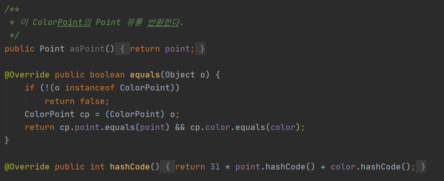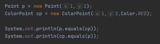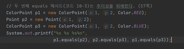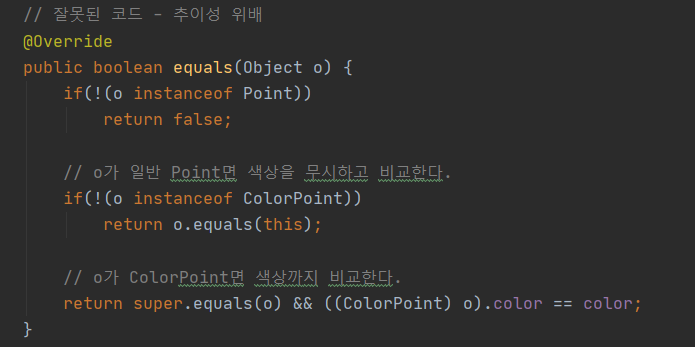 - 이 메서드는 일반 Point를 ColorPoint에 비교한 결과와 그 둘을 바꿔 비교한 결과가 다를 수 있다.