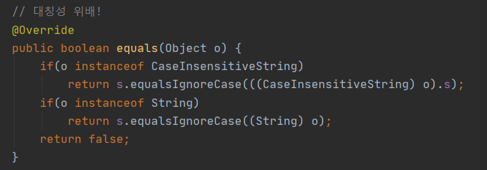 - 이 예는 s.equals(cis)의 결과와 cis.equals(s)의 결과가 다르다.