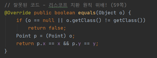 - 반면 equals를 instanceOf 기반으로 올바로 구현했다면 CounterPoint 인스턴스 역시 제대로 동작할 것이다.