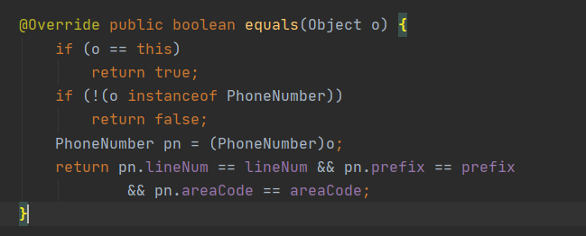 - 다음에 따라 작성해본 PhoneNumber 클래스용 equals 메서드이다.