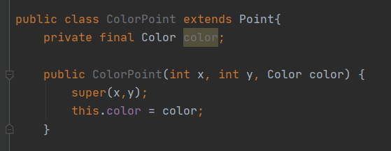 - Point를 상속 대신 Point를 ColorPoint의 private 필드로 두고 ColorPoint와 같은 위치의 일반 Point를