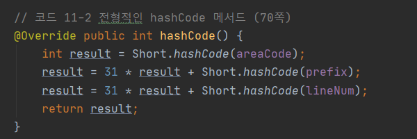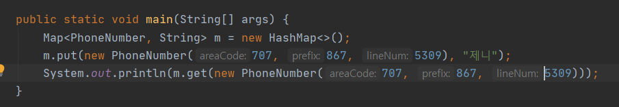 - PhoneNumber 클래스는 hashCode를 재정의하지 않았기 때문에 논리적 동치인 두 객체가 서로 다른 해시 코드를 반환한다.