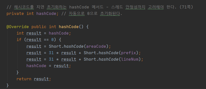 - 해시의 키로 사용되지 않는 경우는 hashCode가 처음 불릴 때 계산하는 지연 초기화 전략이 가능하다.