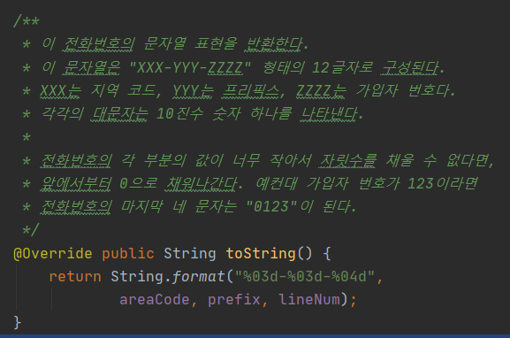 - PhoneNumber 클래스는 지역 코드, 프리픽스, 가입자 번호용 접근자를 제공해야 한다.
