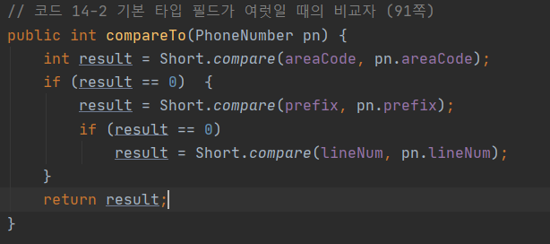 - 그 대신 박싱된 기본 타입 클래스가 제공하는 정적 compare 메서드나 Comparator 인터페이스가 제공하는 비교자 생성 메서드를 사용하자.