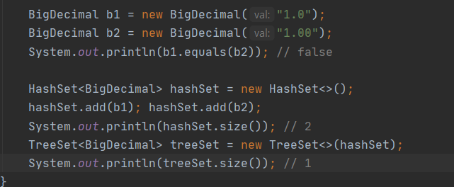 - 이 두 BigDecimal은 equals 메서드로 비교하면 서로 다르기 때문에 HashSet은 원소를 2개 갖게 된다.