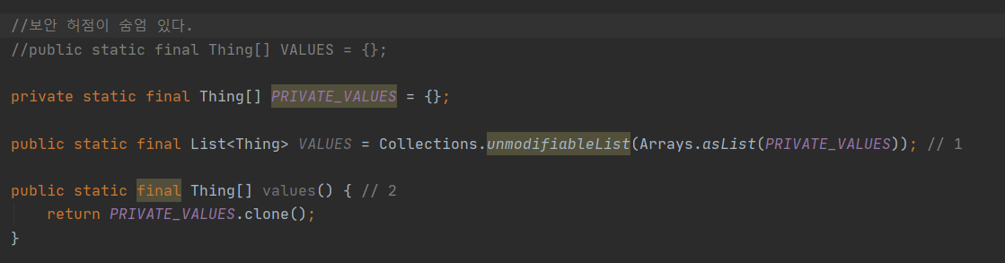 - 클래스에서 public static final 배열 필드를 두거나 이 필드를 반환하는 접근자 메서드를 제공해서는 안된다.