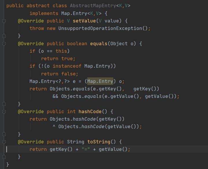 - Map.Entry 인터페이스나 그 하위 인터페이스로는 이 골격 구현을 제공할 수 없다. 디폴트 메서드는 equals, hashCode, toString 같은 Object 메서드를 재정의할 수 없기 때문이다.