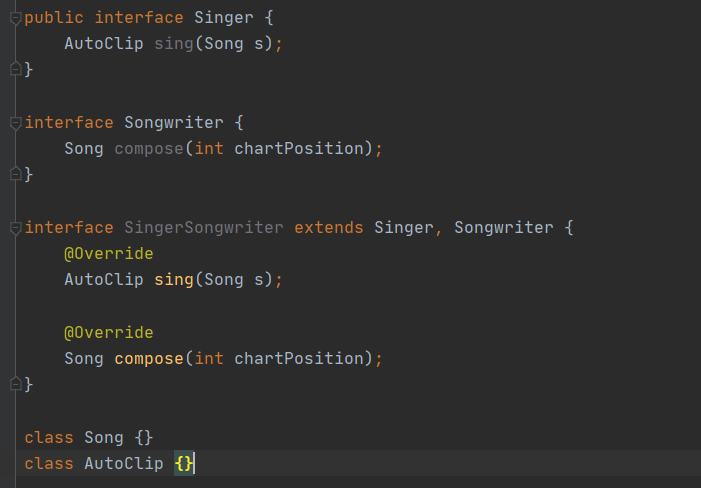- 또한 Singer와 SongWriter 모두를 확장하고 새로운 메서드까지 추가한 제3의 인터페이스를 정의할 수도 있다.