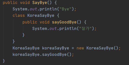 - 지역 클래스는 지역 변수를 선언할 수 있는 곳이면 실질적으로 어디서든 선언할 수 있고, 유효 범위도 지역변수와 같다.
