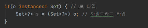 o 타입이 Set임을 확인한 다음 와일드카드 타입인 Set<?>로 형변환 핵심 정리