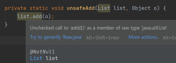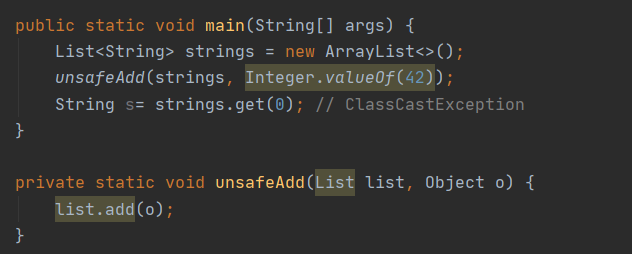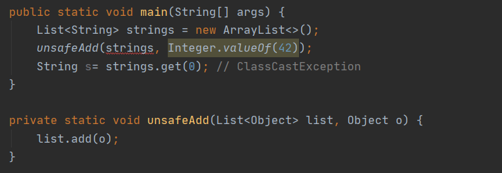 Integer를 String으로 변환하려 시도한 것 - 다음의 예는 컴파일은 되지만 로 타입인 List를 사용하여 unchecked call이 발생하고 strings.get(0)의 결과를 형 변환하려 할 때 ClassCastException을 던진다.