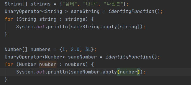 - 하지만 항등함수란 입력 값을 수정 없이 그대로 반환하는 특별한 함수이므로, T가 어떤 타입이든 UnaryOperator<T> 를 사용해도 타입 안전하다.