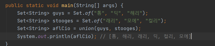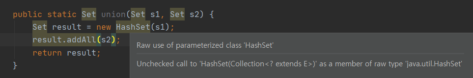 - 제네릭 메서드 작성법은 제네릭 타입 작성법과 비슷하다. 다음은 두 집합의 합집합을 반환하는, 문제가 있는 메서드다.